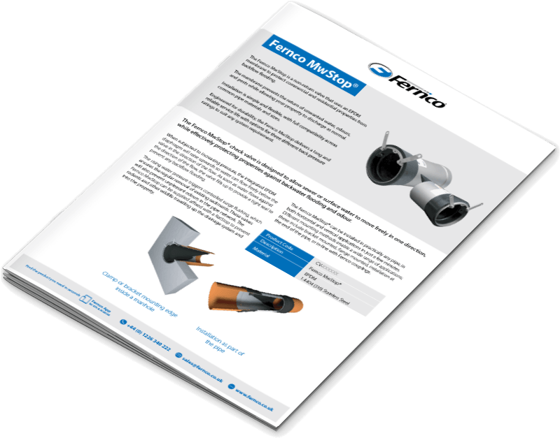 The Fernco MwStop® check valve is designed to allow sewer or surface water to move freely in one direction, while effectively protecting properties against backwater flooding and odour.